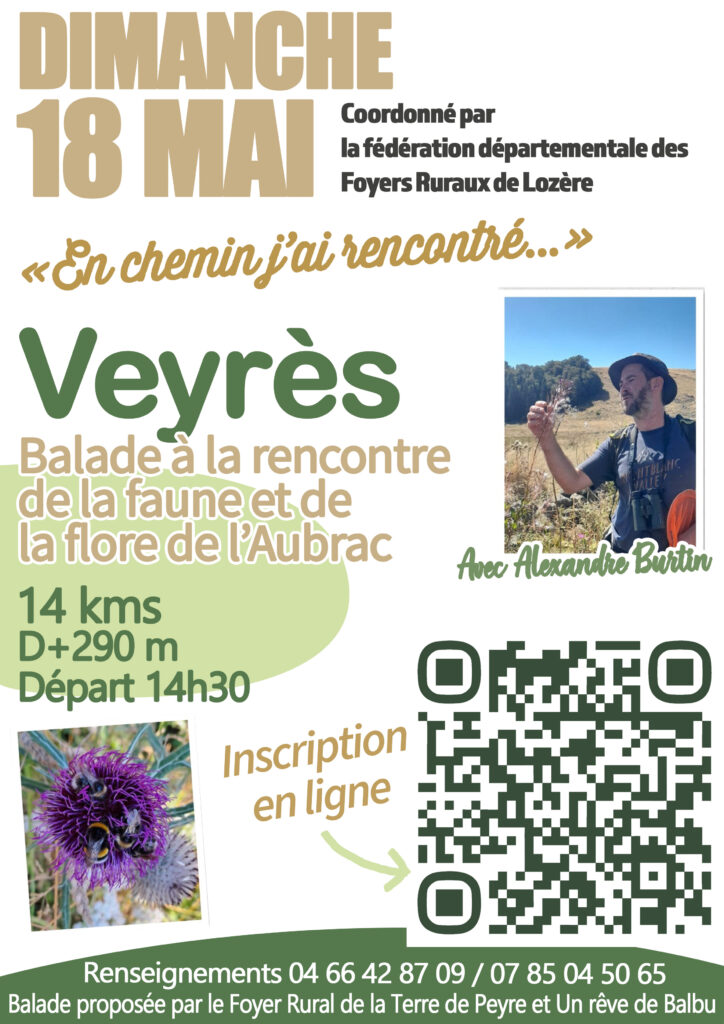 Le Foyer Rural de la Terre de Peyre et Un rêve de Balbu vous proposent de partir à la rencontre de la faune et de la flore de l’Aubrac sur la commune de Veyrès le dimanche 18 mai.