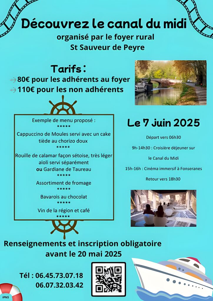 Le Foyer Rural de Saint Sauveur de Peyre organise une journée croisière sur le canal du midi le 7 juin.